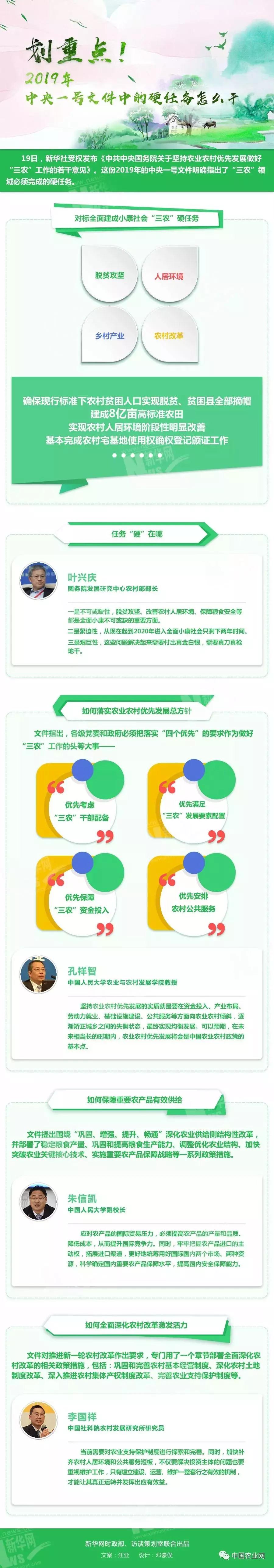 《中共中央国务院关于坚持农业农村优先发展做好“三农”工作的意见》已于2019年2月19日由新华社授权发布。这份2019年的中央一号文件明确提出了“三农”领域必须完成的硬任务。硬任务硬在哪里?硬任务怎么干?请看专家怎么说。