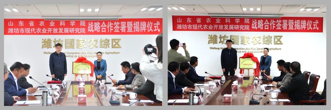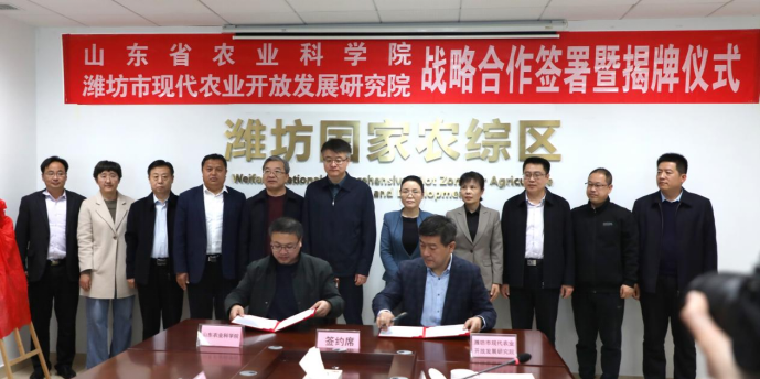 为全面落实乡村振兴战略,不断提升现代化农业发展水平,3月8日上午,“山东省农科院与潍坊市现代农业开放发展研究院战略合作协议签署暨分院授牌仪式”在潍坊国家农综区总部基地成功举行,山东省农科院成果转化与推广处处长杨英阁、潍坊国家农综区推进办副主任李秀明,潍坊市现代农业开放发展研究院主要负责人出席,潍坊市科技局、寒亭区科技局和昌邑市、安丘市、高密市、潍城区、临朐县农业农村局、开元街道等部门相关负责同志参会