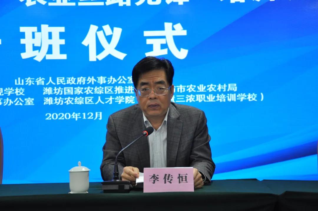 潍坊政协副主席李传恒在致辞中介绍,潍坊是农业产业化的发祥地,三个模式的诞生地,自古就有中国农业看山东,山东农业看潍坊之说,2018年8月31日国务院批准设立潍坊国家农业开放发展综合试验区,综试区建设按照国际眼光、世界标准,打造全国农业开放发展引领区、农业科技创新先行区、农村一二三产业融合发展示范区。乡村振兴人才是关键,潍坊国家农综区依托潍坊慧三浓职业培训学校成立潍坊国家农综区人才学院,学院成立以来,累计培训各类人才6万余人,为乡村振兴提供了人才支撑。