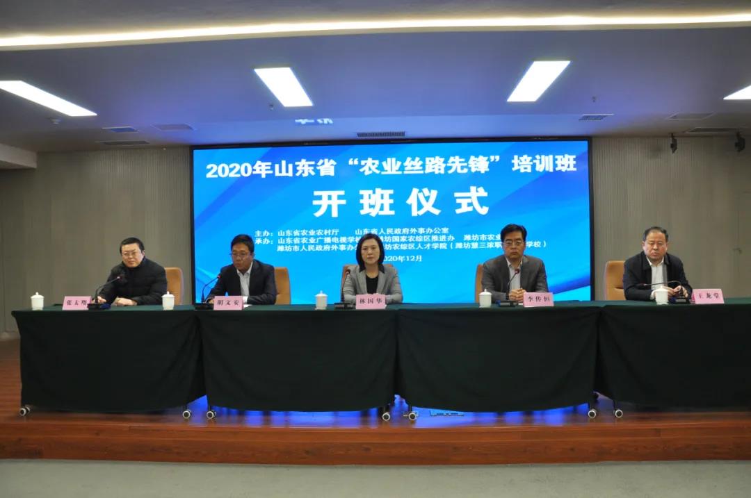 12月6日,山东省“农业丝路先锋”第二期培训班(三班、四班)按计划继续在潍坊国家农综区人才学院(潍坊慧三浓职业培训学校)开班。省农业农村厅一级巡视员林国华、潍坊市政协副主席李传恒、省农业农村厅对外合作处处长明文安、潍坊国家农综区推进办常务副主任王龙堂、潍坊市农业农村局副县级干部张太翔等领导出席开班仪式,林国华巡视员、李传恒副主席分别致辞,明文安处长主持了开班仪式。