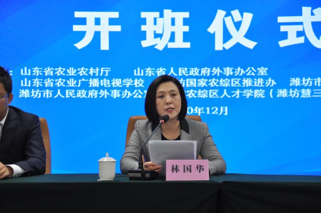 林国华巡视员在致辞中说,为认真落实全省关于乡村振兴战略特别是人才振兴的部署,今年以来,省农业农村厅在省外事办公室的大力支持下,决定开展以“农业丝路先锋”为主题的人才培育工程。通过国内、国外培训,提升我省外向型农业人才的视野和水平,积极应对疫情影响下的国际外贸。下步将积极整合外事渠道资源、人脉资源,邀请资深外交官、外国农业专家、大学教授以及优秀的企业家等来鲁授课,条件成熟的话还要“走出去”,学习新技术、传播新理念、启发新思想,助力我省农村发展“眼光”向外,推动乡村振兴博采众长,以实际行动为打造齐鲁样板贡献力量,开创山东农业对外合作新局面。