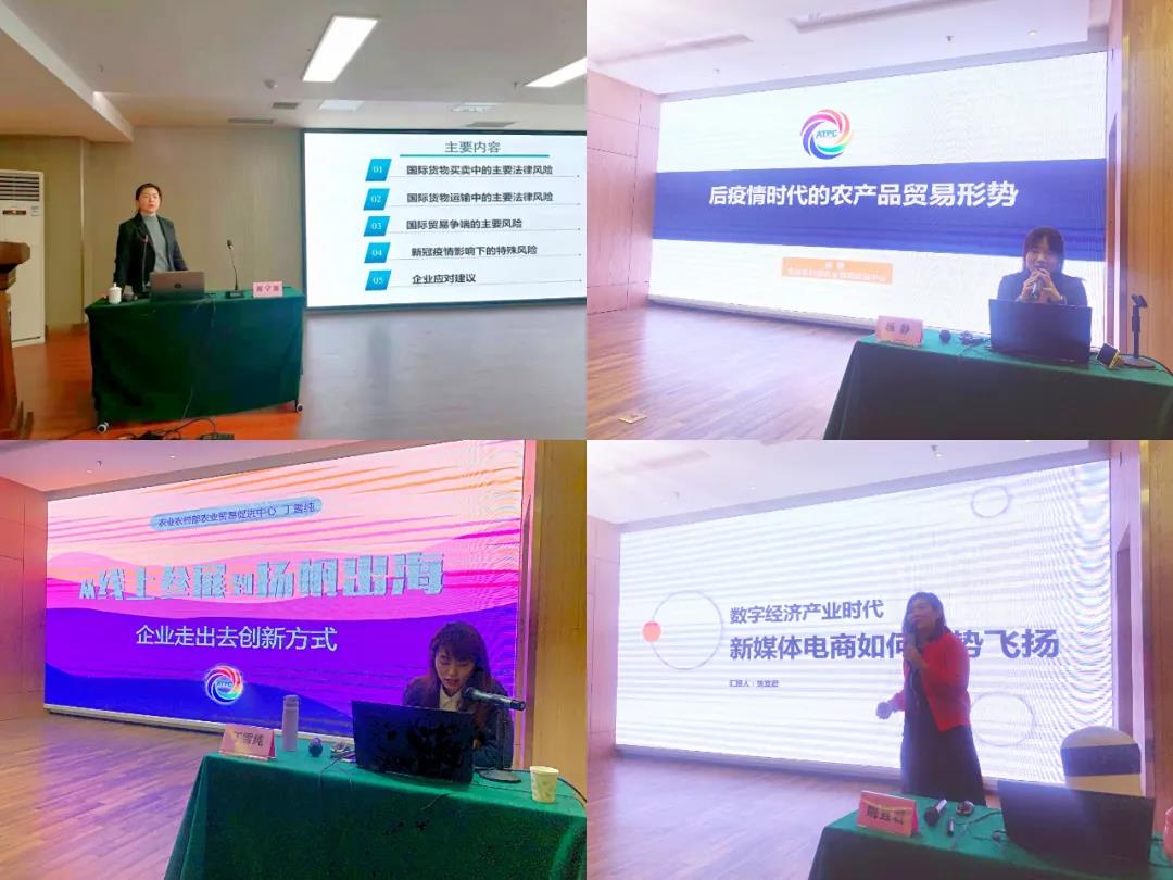 华东理工大学教授、农业农村部农业对外合作法律顾问专家组成员祝宁波进行了《新冠疫情背景下农产品国际贸易法律风险与应对》专题讲座。农业农村部农业贸易促进中心农业贸易与发展政策研究所副所长杨静进行了《后疫情时代的农产品贸易形势》的讲解。农业农村部农业贸易促进中心联络合作处丁雪纯进行了《企业走出去创新方式》的讲解。山东省品牌建设促进会、新媒体研究院负责人、万堂书院特约讲师姚宜君讲解了《数字经济产业时代新媒体电商如何逆势飞扬》的专题讲座。