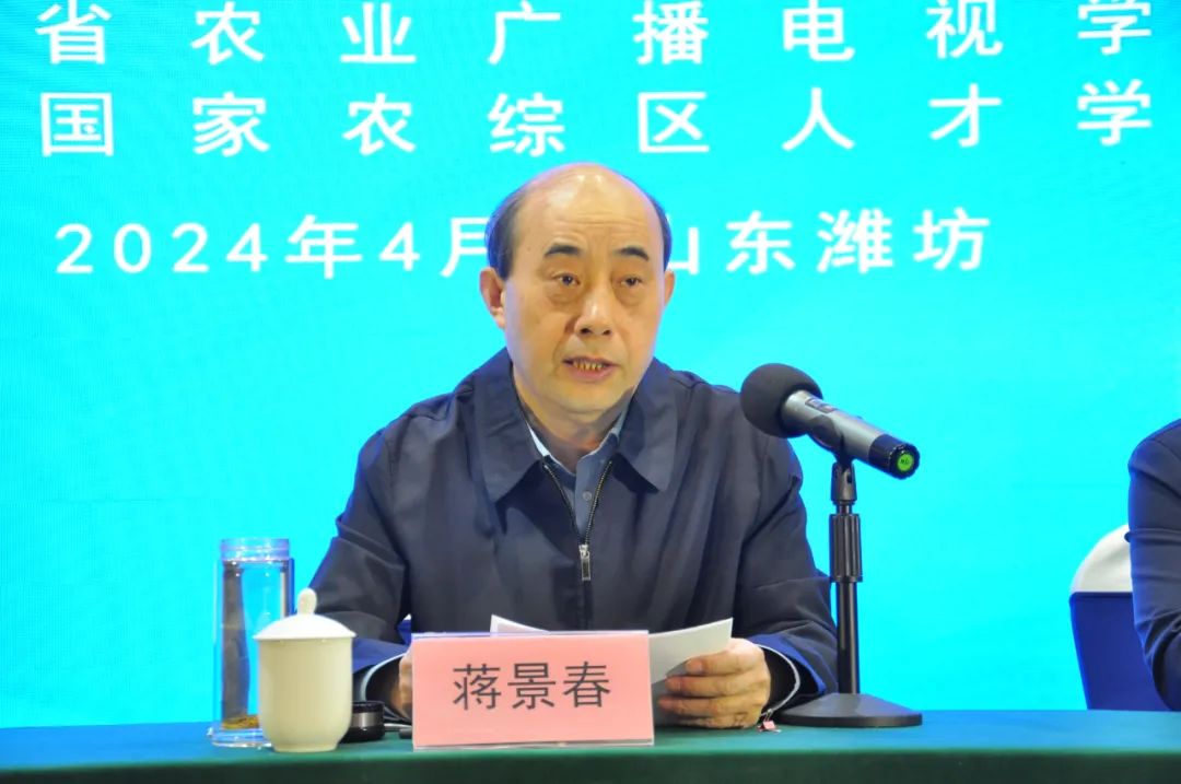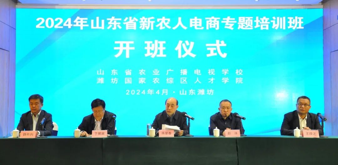2024年4月8日,山东省新农人电商专题培训班(第一期)在潍坊开班,山东省农业农村厅二级巡视员蒋景春出席开班仪式并讲话,潍坊市农业农村局副局长于鹏展、潍坊市农技推广中心副主任王焕之、潍坊国家农综区推进办四级调研员魏希利出席,山东省农广校校长赵冰主持开班仪式。培训班共分6期,每期7天,来自济南、淄博、枣庄、东营的100名农民学员参加首期培训。